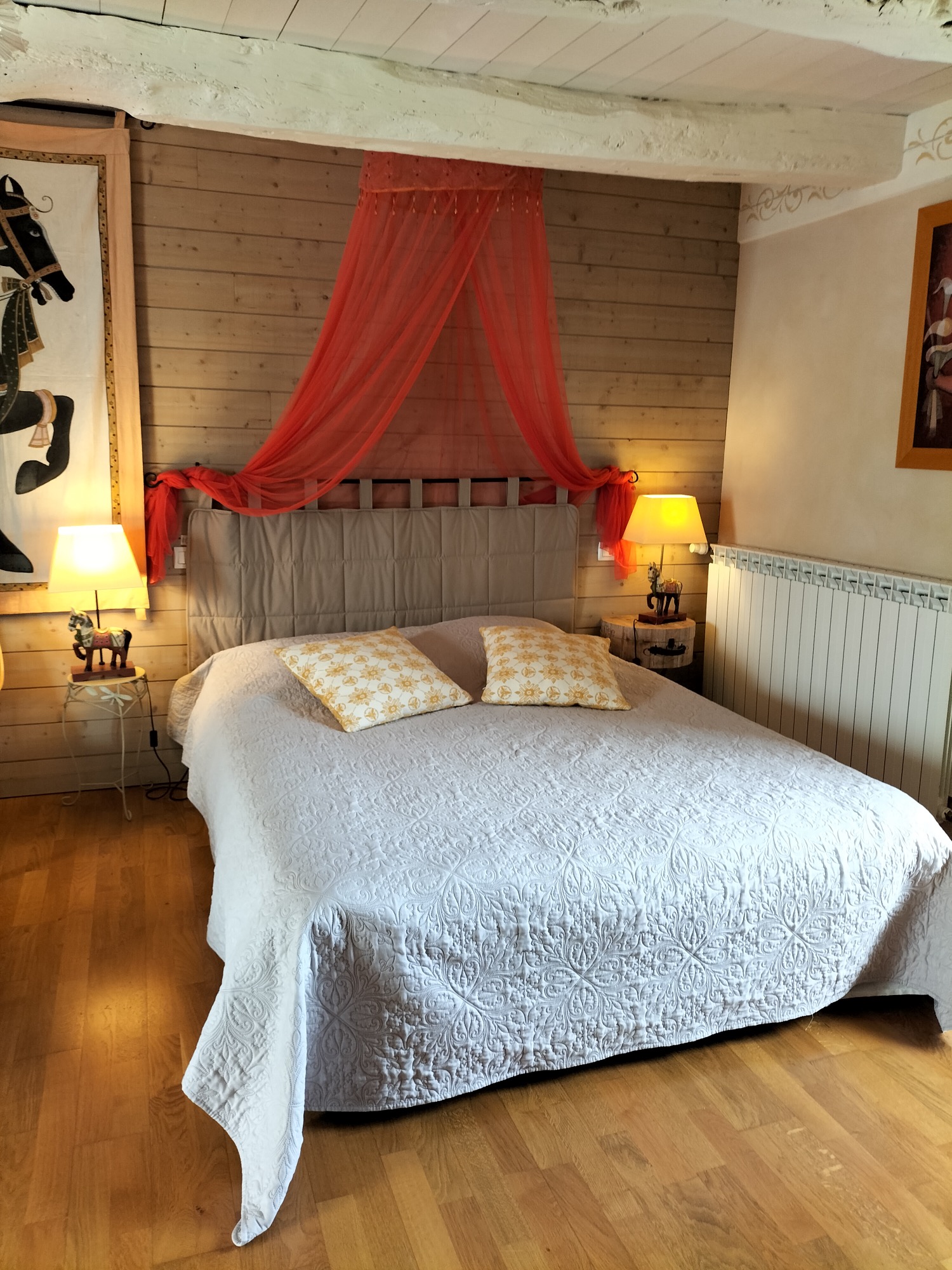 Pour 2 à 3 personnes, cette chambre très spacieuse dispose d'un lit double 160 x 200 et d'une banquette lit de 80 x 190. Située au 1er étage avec parquet, toilettes et salle d'eau privées.